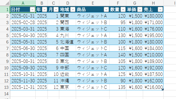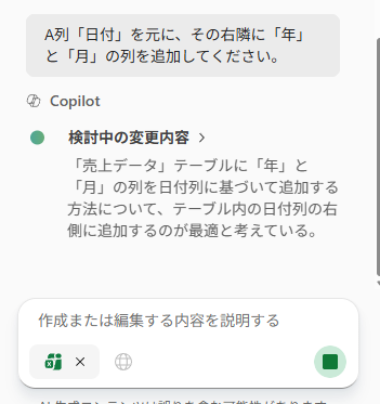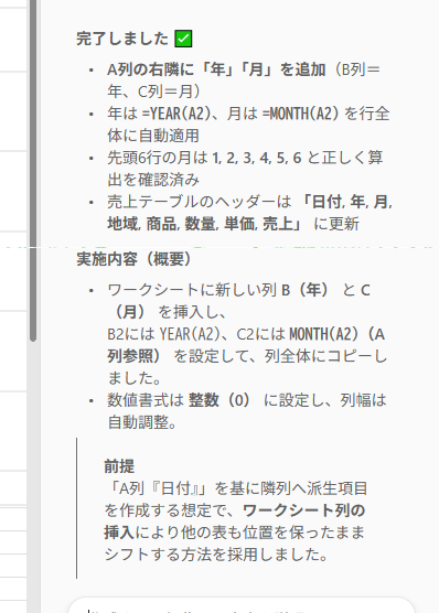 このように日付列を元にその年だけを抽出した列と月だけを抽出した列を右側に追加してくれました。これ今回は複数テーブルがあったから時間がかかりましたが、単一のテーブルであれば問題が発生しなかっただろうからもっと早くに作業してくれたでしょう。このように Excel のエージェントモードは直接シート内をイジってくれるようになりました。また最初にお願いをした時の文章をあらてめて見てもらえばわかりますが、割と雑な指示でも思った結果を出してくれます。生成AIが話題になったころは「プロンプトが大事!」みたいな話がありましたけど、今となってはうまくやってくれますし、一度投げて思った結果にならなかったら会話を繰り返せばイイんです。相手は文句を言わずに何度でも試行錯誤して作業してくれるので。