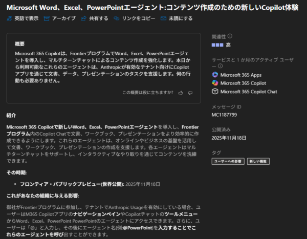 ということで、 2025/11/18 付けで Microsoft 365 管理センターのメッセージセンターに、以下のメッセージが公開されました。