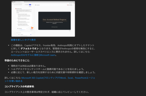 次に Word Excel PowerPoint エージェントは Anthropic 社の Claude というモデルを利用するので、現時点では既定では利用できない設定になっているので許可する必要があります。ただ一つ注意点があり、これも現時点ではの話ですが、 Anthropic のモデルを利用する時は Microsoft 365 Copilot のエンタープライズデータ保護外になってしまい、 Anthropic 社のデータ保護や規約に従う形になります。なのでこれまでも許可がなかなかできない企業も少なくはないでしょう。