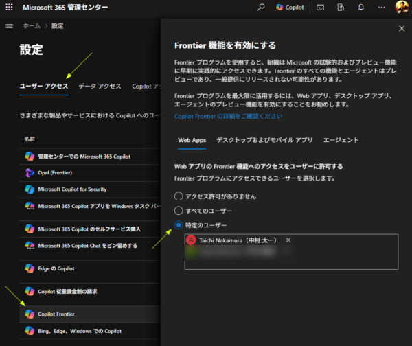 ▼「ユーザーアクセス」内の「 Copilot Frontier 」