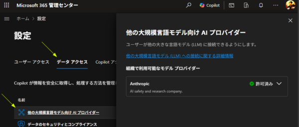 ▼「データ アクセス」に切り替えて「他の大規模言語モデル向け AI プロバイダー」をクリックし、 Anthropic を許可する(スクショはすでに許可済みにされている状態)