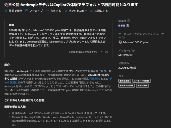 しかし、来年2026年1月7日に Anthropic のモデルが既定で許可になるようです。 2025/12/08 付けで Microsoft 365 管理センターのメッセージセンターに、以下のメッセージが公開されました。