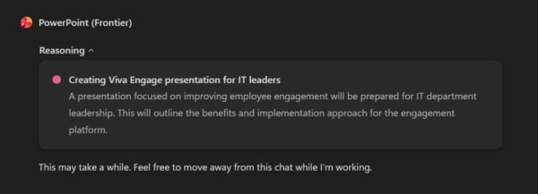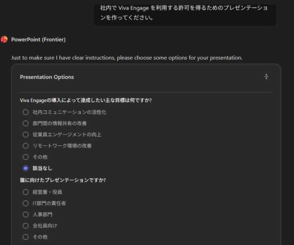 ▼とりあえず PowerPoint (Frontier) エージェント にこんなお願いをしてみます