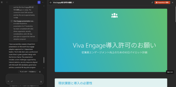 このように Copilot Chat は左に寄せられ、ブラウザー内で Copilot が作ってくれたプレゼンテーションを確認する事ができます。