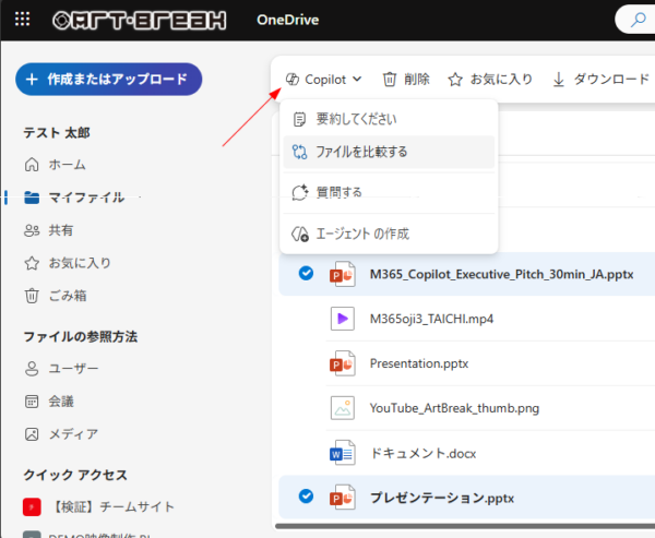 ▼複数ファイルを選択し、コマンドバーの「 Copilot 」からアクセス