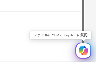 これまでは何もファイルを選択していない状態だと Copilot メニューは表示されなかったけど、この右下の Copilot ボタンは常に右下に表示されています。縦スクロールをしても常に固定表示です。