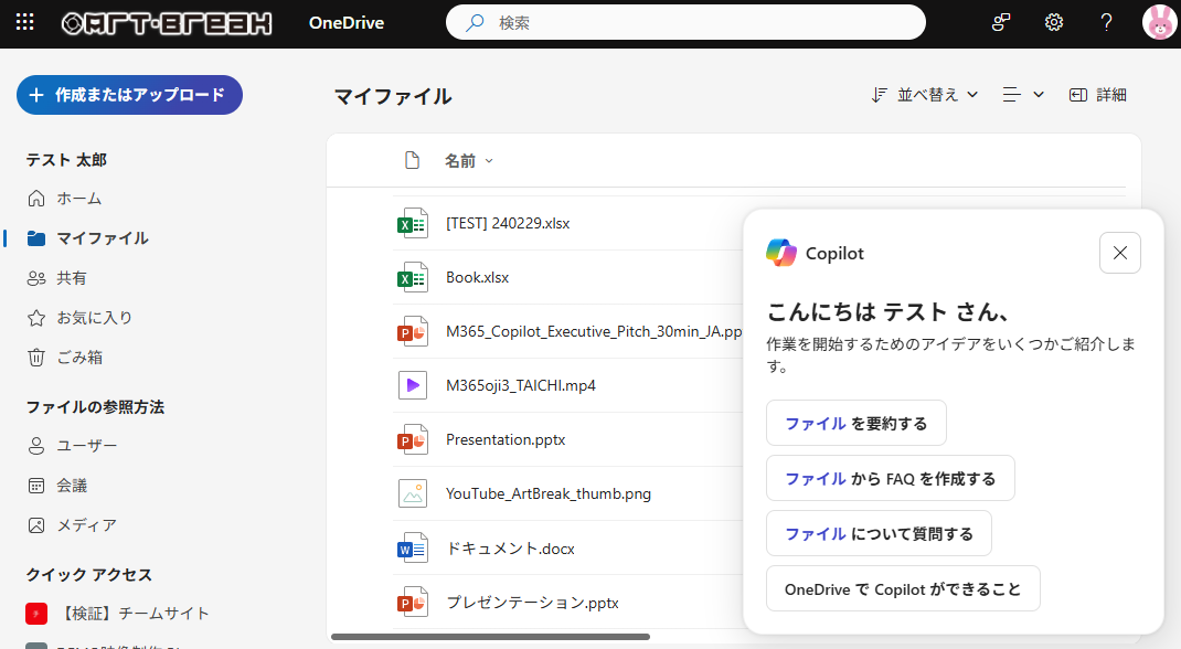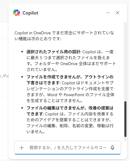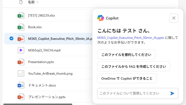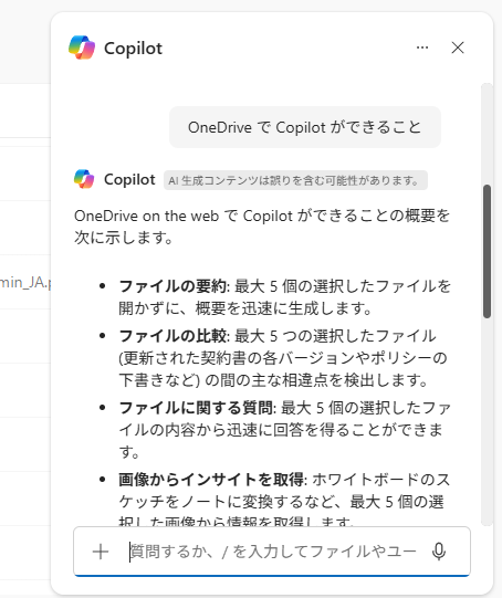という事で、サッと触った感じだと単に Copilot へアクセスできる導線が追加されたけど、このボタンが常に表示されている事により、 OneDrive でも Copilot が使えるんだというユーザーへの認知につながると思います。そして今後の Copilot in OneDrive の機能追加の前準備みたいな雰囲気も感じます。