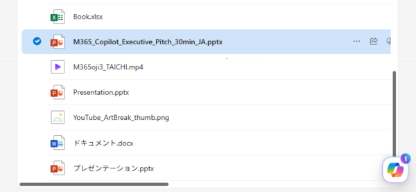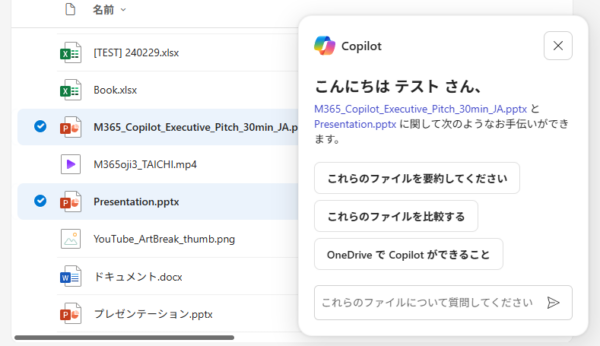 ファイルを選択すると Copilot ボタンに「1」とバッジが表示されますね。いくつファイルを選択したのかがわかるようになります。クリックすると、