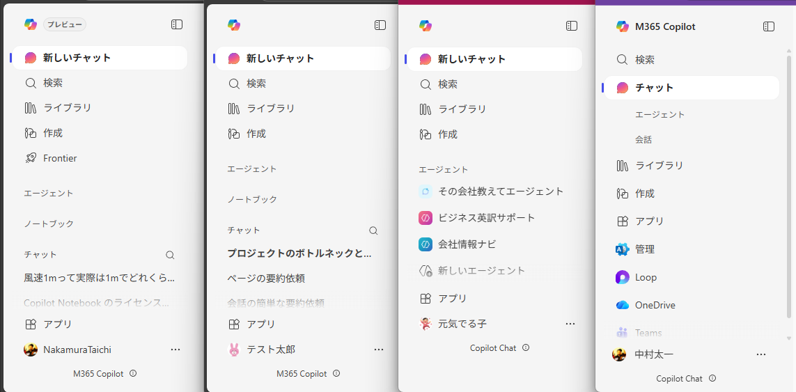 で、M365 Copilot ライセンス保有ユーザーはすぐに切り替わったけど、 M365 Copilot ラインセンス未保有ユーザーは全然切り替わらないので、もしかしてライセンスないと新しくならないの?とか思いましたが、この3番目のユーザーの通り、ようやく最近 M365 Copilot ライセンス未保有ユーザーでも切り替わっているようです。そして4番目を見るとひとりだけ上部に「 M365 Copilot 」の表記がありますね。これ旧UIのナビゲーションでは表示されていて、新UIに切り替わった当初はまだ表示されていたけど、いつしか消えてしまった…という経緯があります。複雑怪奇ですね。