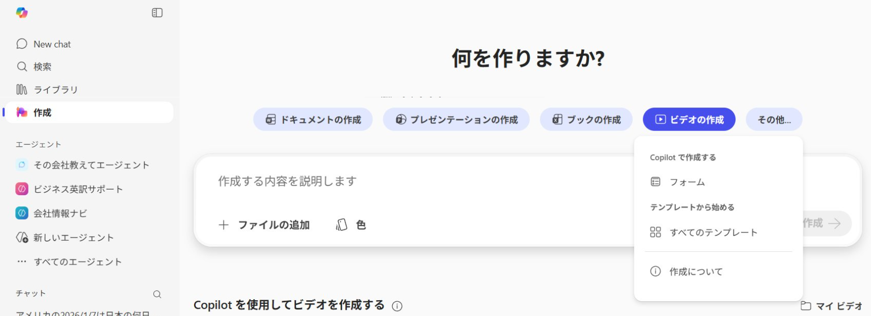 M365 Copilot ライセンスがあるユーザーは問題ないです。このように上部のボタンに「画像の作成」「ビデオの作成」があります。ここから Copilot に画像や動画を作成してもらう事ができます。