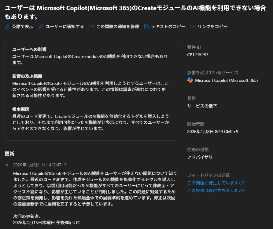 Microsoft MVP 受賞ほやほやの仲間 おゆさんから情報いただきました。半月以上前に表示されなくなったこのトラブルが、ちょうど昨日 Microsoft 365 のサービス正常性にアクティブな問題として掲載されたようです。