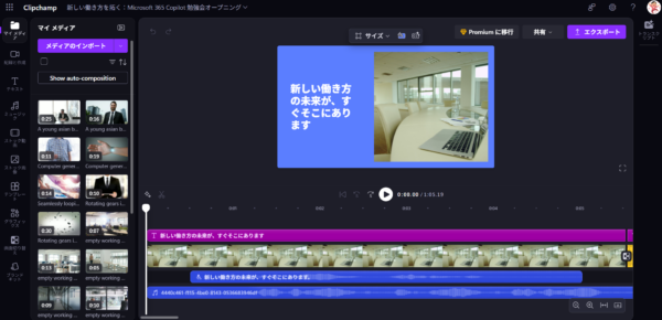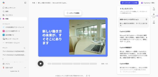 こちらも動画生成してくれる生成AIは他のモデルでもできますが、生成してくれた動画の簡単なトランスクリプトの編集などは人間の手作業でサクっと変更できるので、 Copilot と人間の共同作業が実現できます。また、更に動画編集したい場合は、 Microsoft 365 の動画アプリである Clipchamp でプロジェクトとして開くことができます。右上の「 Clipchamp で開く」をクリックすると、
