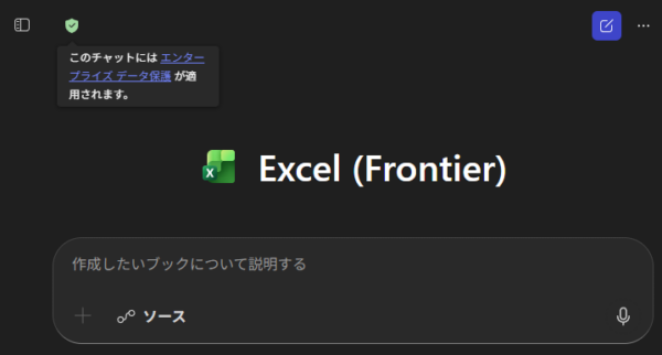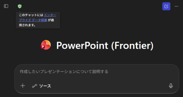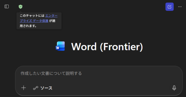 安心安全のバロメーターである盾アイコンが緑色になっていて「エンタープライズデータ保護が適用されています。」状態です。これがあってはじめてユーザーは安心して利用できますね。あ、これウィンドウサイズを狭くしているので左上に盾アイコンがありますが、ウィンドウサイズが広ければ通常の Copilot Chat と同じ右上に盾アイコンが表示されていますよ。