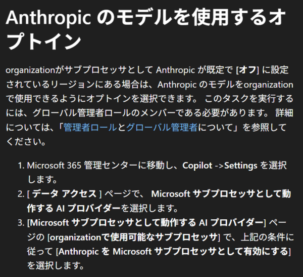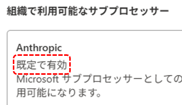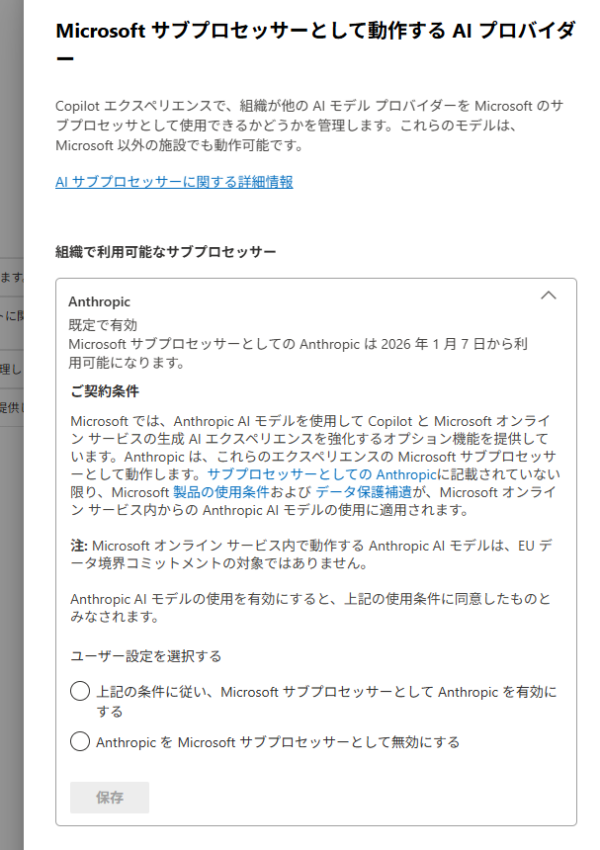 これは1月14日の記事からずっとモヤモヤしていた事だけど、 2026/01/07 から Anthropic モデルが既定で利用可能になるというメッセージがあったにも関わらず、「Microsoft サブプロセッサーとして動作する AI プロバイダー」という設定項目には管理者に有効/無効を選択させるようになっています。