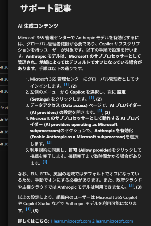 全て僕の頭の中の理解なので、もしテナント管理者の方が不安に思う場合は Microsoft サポートに問い合わせましょう。たぶん合ってると思います。現にここを何も設定していなくても Claude を利用できているので。