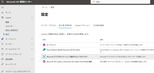 これはテナント管理者が Microsoft 365 管理センターの左ナビの「 Copilot 」→「 設定 」をクリックし、上部の「データ アクセス」タブ内に存在する設定項目です。