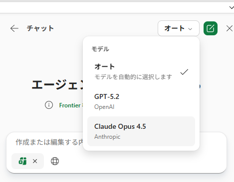 既定で利用可能になるって言っていたのにこのような選択項目があるって事は、テナント管理者が「有効」に設定しないと使えないの?ってなるじゃないですか。でも、実際はこの設定を未選択にしている状態でも Anthropic モデルは利用できているようです。今はまだリサーチツールエージェントの Claude の利用ができない状態が続いているので、確認できる手段は Excel のエージェントモードで Claude Opus 4.5 を利用してみるとわかります。使えるんです。