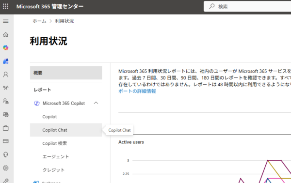 スクショを撮っている環境は検証用というか見せても問題ないテナントですが、テナントが払い出されてから一度も設定項目を変更していない環境です。また Microsoft 365 Copilot ライセンスが1つもないので、 Microsoft 365 ライセンスだけでも利用状況が確認できる Microsoft 365 の Copilot Chat を例に挙げます。とりあえずここをクリックすると、