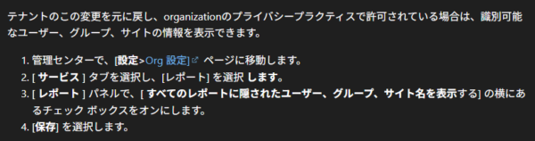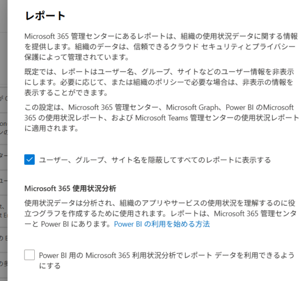 さっき説明した通り、このテナントは管理設定を一切変更していない状態です。それでこれをサッと読むと「ユーザー、グループ、サイト名を隠蔽してすべてのレポートに表示する」という項目にチェックされているんです。