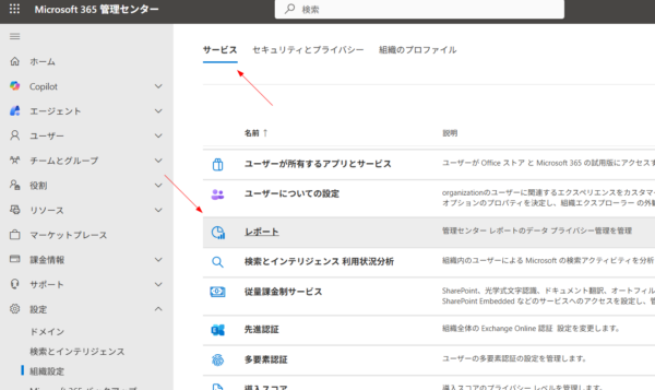 ▼ Microsoft 365 管理センターの「レポート」の「利用状況」