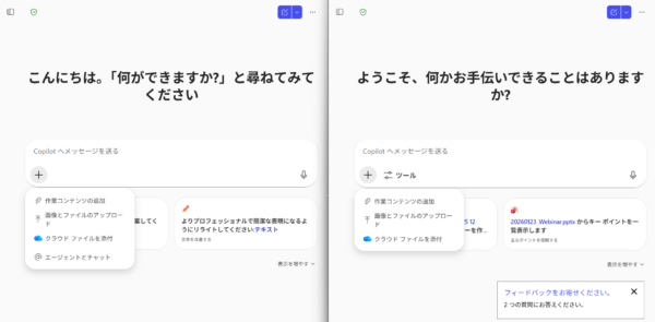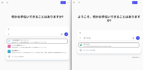 このように左はツールがない状態、右はツールがある状態の時に、双方で「+」ボタンをクリックするとわかりますが、ツールがない左側のユーザーの+ボタン内に「@ エージェントとチャット」というメニューがありますが、右側のユーザーの+ボタン内にはそのメニューはないですよね。この「@ エージェントとチャット」という日本語だけを読めば2つ解釈ができて「 Agent and Chat 」にも解釈できるし「Chat with an agent」にも解釈できます。ここでは後者の方の意味です。「エージェントとチャットをする」という意味です。