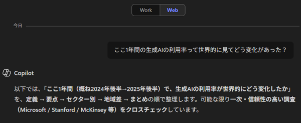 ▼例えば Microsoft 365 Copilot Chat に仕事に関する気になる事を気軽に相談します