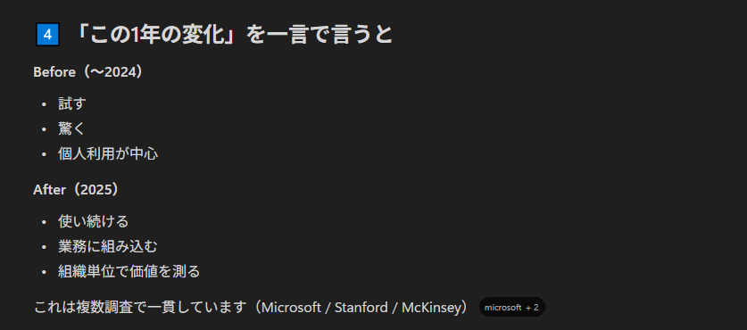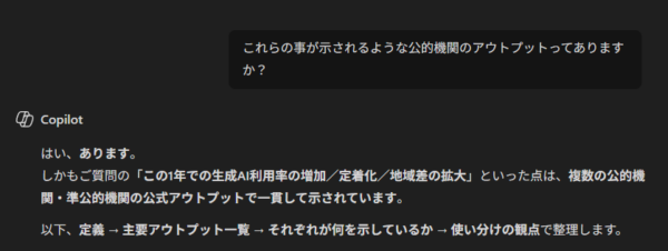 最初から目的を持ってふさわしいエージェントに切り替えて依頼をする使い方もありますが、今回のように Copilot Chat との日常的な会話の中で業務に役立ちそうな流れを感じたら専門のエージェントを呼び出してお願いをするような流れが良いんだと思います。それまでの Copilot Chat との会話をくみ取ってくれた上でリサーチツールエージェントにバトンタッチしますからね。今回のアウトプットも後で読んだけど大変興味深いものでした。