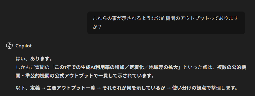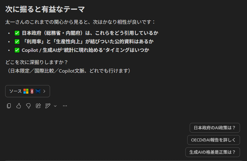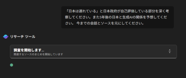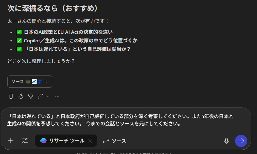 「日本は遅れている」という自己評価があるのが気になりました。これはイイなと思って、政府が日本は遅れているという自己評価部分をこれまでの Copilot Chat との会話とソースを元に政府の自己評価を深掘りして更に5年後の日本と生成AIを予想してもらおう!リサーチツールエージェントに!