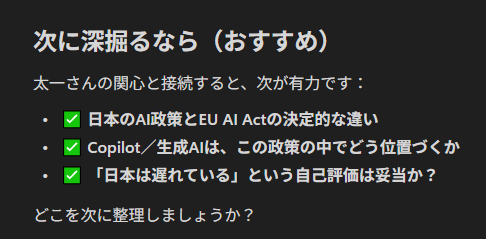 国内の説得力ありそうな公的機関として「日本政府」が挙げられているので、さらに深掘りして聞いてみます。下のレコメンドに「日本政府のAI政策は?」とあったので、そのまま使って質問を再度すると、
