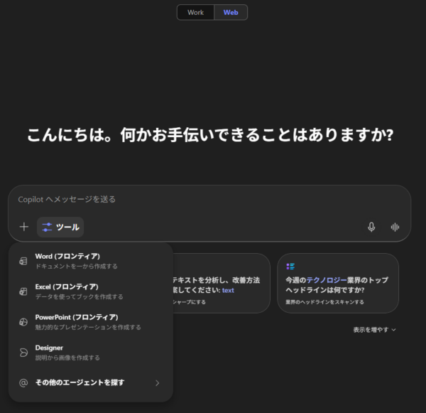 さて、今 Microsoft 365 Copilot ライセンスがあってフロンティアプログラムユーザーだと、「ツール」の中は、