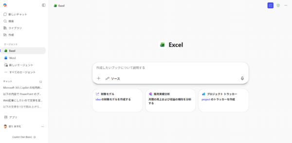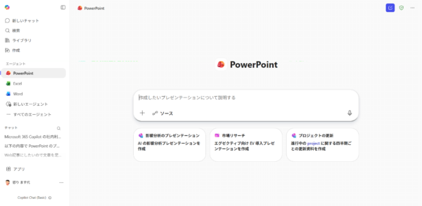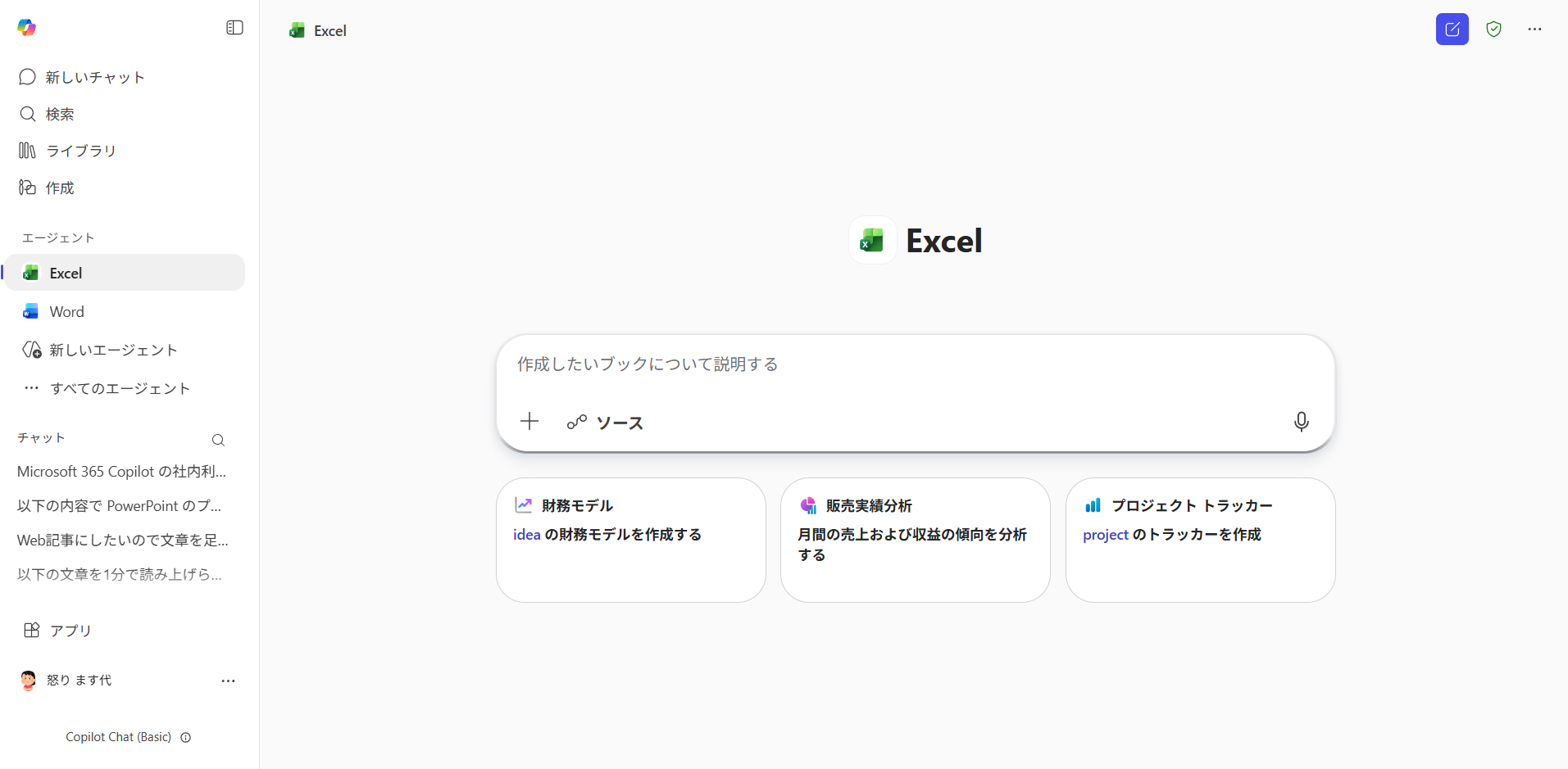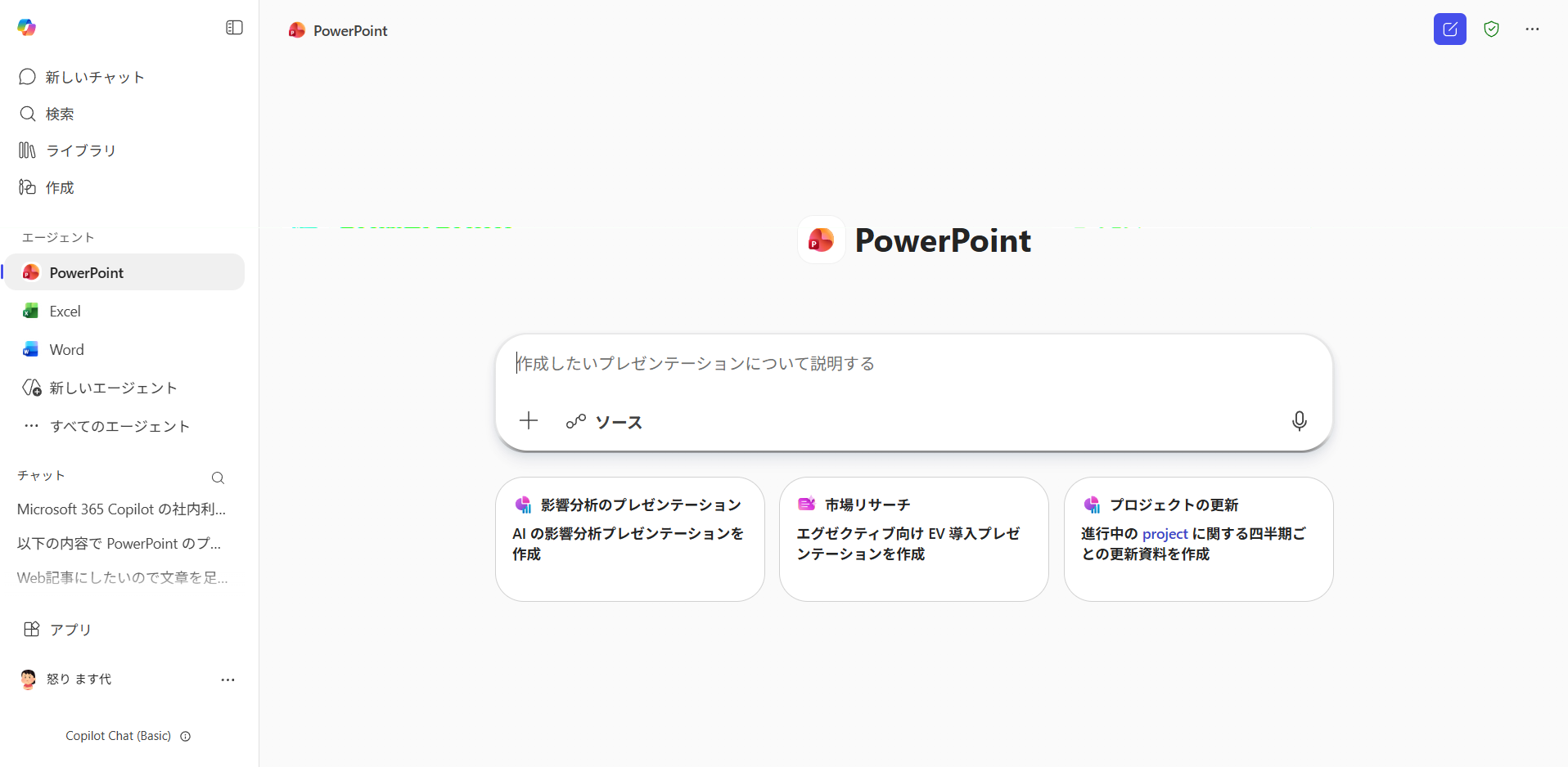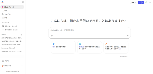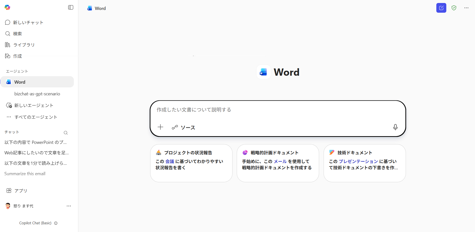 上部に「 Work / Web 」のボタンもないし、左下に「 Copilot Chat (Basic)」の表記もあります。つまりこのユーザーは Microsoft 365 ライセンスは保有しているものの、 Microsoft 365 Copilot ライセンスは保有していません。この状態で、