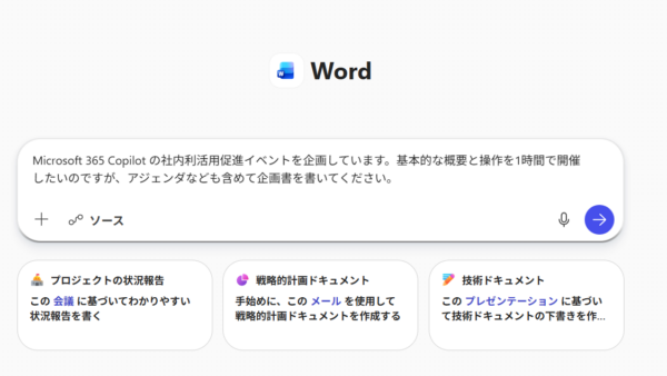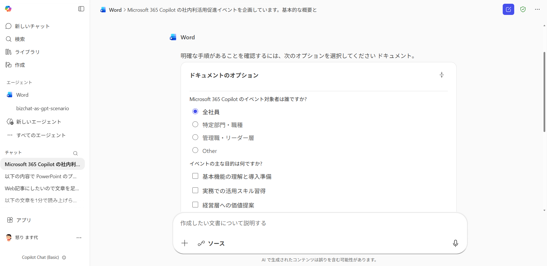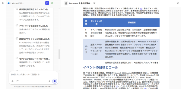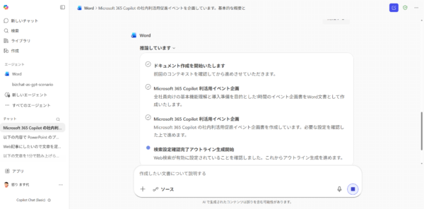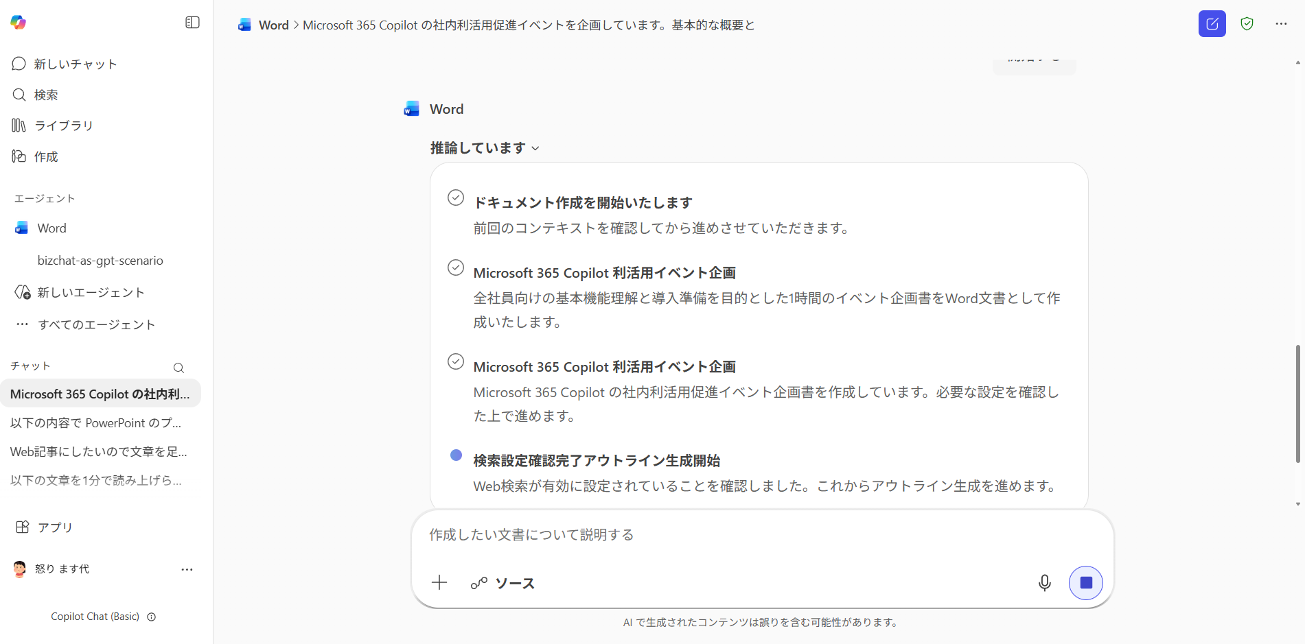 このようにチャットUIから Word ファイルを作ってもらう事は通常の Copilot Chat でもできますが、 Word エージェントであればこのように作ってくれたドキュメントを画面上で確認しながら Copilot と試行錯誤できるのが大きな魅力ですね。