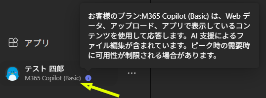 ここでも後半の方に相変わらず Microsoft 365 Copilot ライセンスを持っていないユーザーは、各アプリ内の Copilot ボタンをクリックするとただの Copilot Chat が既定で開くようになっている事がわかります。