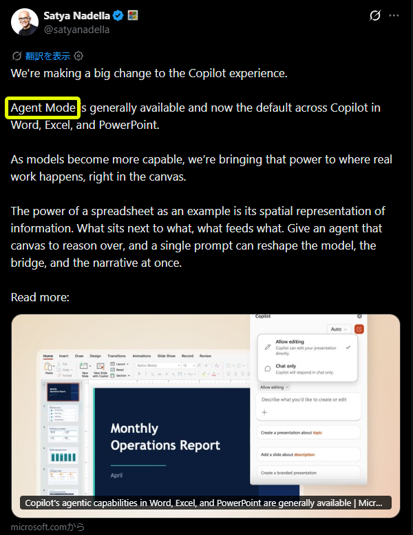 英語の記事ですが、記事タイトルだけ機械翻訳してもらうと「CopilotのWord、Excel、PowerPointにおけるエージェント機能は一般公開されています。」という事です。